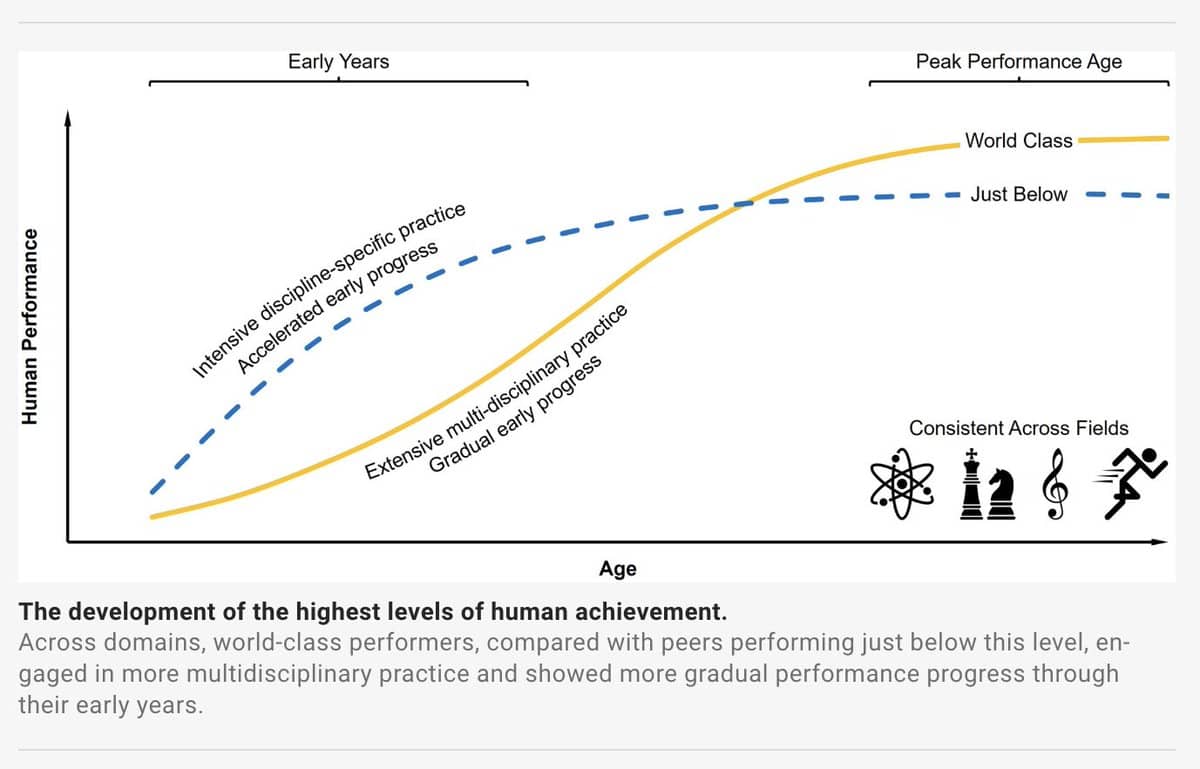 The study's findings (and its flaws) mirror one of the main arguments in David Epstein's excellent book Range: In kind environments (where the rules stay the same and the variables are numbered and controlled), early specialization may prove useful. Chess and musical composition are textbook examples of kind environments. However, in wicked environments (where the rules are subject to change and there are hundreds of interacting variables) then early specialization often gets in the way of later performance. Sport, academics, and science are great examples of wicked environments.